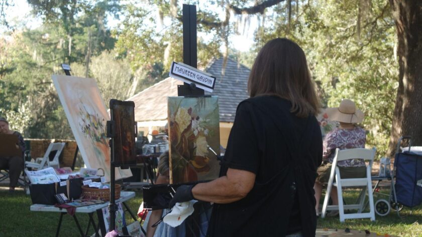 Visitors browse plants and paintings beneath the mossy oaks at Rosedown Plantation during the 36th annual Southern Garden Symposium in St. Francisville. Local artists from The Art House painted floral arrangements on-site as part of this year’s new focus on integrating art and community.